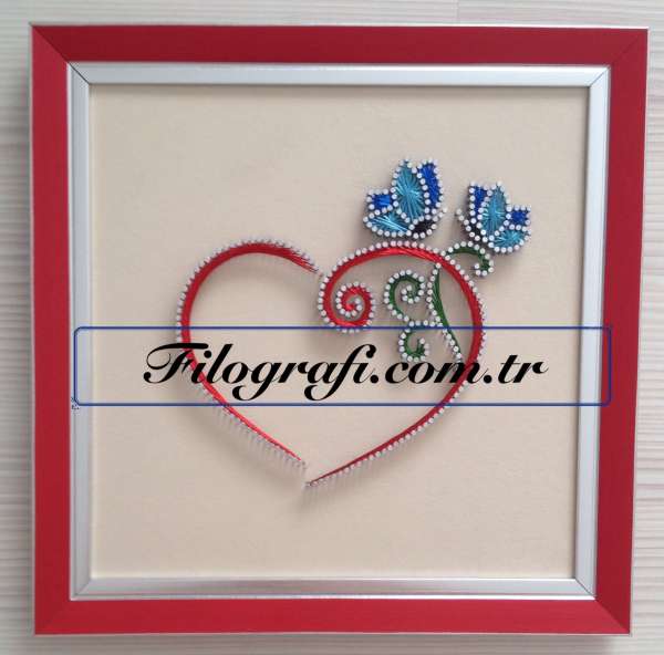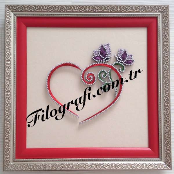 "Filografi Tablolar, Ahşap Üstüne gerilmiş kadife,taytüyü,deri vb. bir zemin üzerine çakılan çiviler arasından tellerin geçirilmesi ve belirli örgü teknikleri kullanılarak çeşitli desenlerin meydana getirildiği bir sanattır. Kullanılan özel örgü teknikleri sayesinde tablo hem 3 boyutlu bir görünüm kazanmakta hemde işlenen teller yansıyan ışıklarla çok güzel renkler vermektedir. Kullanılan teller bakır olup paslanmaz özelliktedir,kullanılan çivilerde paslanmaya karşı özel olarak boyanmaktadır." Tabloyu detaylı incelemek için resme tıklayın.
